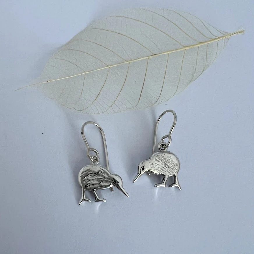 Sweet little Kiwi earrings cleverly cast in sterling silver from an original Tania Mallow carving, finished with a sterling silver hooks.